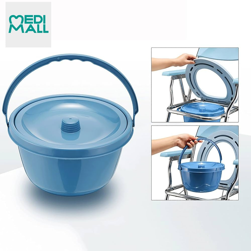 هذا الوعاء البلاستيكي مع غطاء ومقبض يُستخدم كقطعة غيار أساسية لكرسي الحمام الطبي